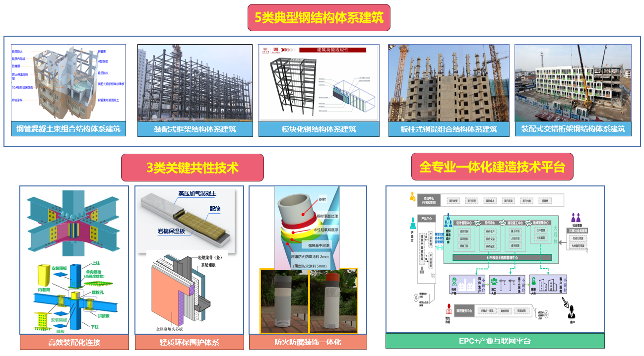 (1)鋼結構建筑產業(yè)化關鍵技術:研發(fā)了剪力墻、框架、模塊化、板柱結構和交錯桁架等5類典型鋼結構體系建筑產業(yè)化集成技術,重點突破了鋼結構建筑產業(yè)化需重點突破的高效裝配化連接、輕質環(huán)保圍護體系、防火防腐裝飾一體化3類關鍵共性技術,開發(fā)了全過程、全專業(yè)協(xié)同一體化智能建造技術平臺。