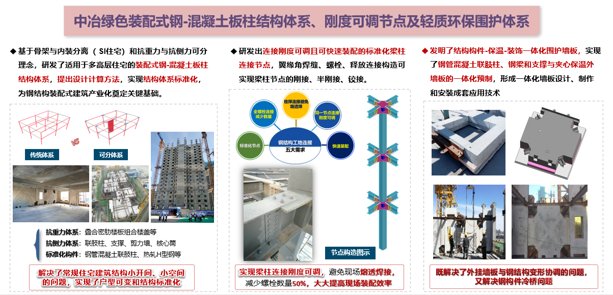 (3)中冶綠色鋼結構裝配式建筑關鍵技術:創(chuàng)新研發(fā)出適用于多高層住宅的裝配式鋼-混凝土板柱結構體系,開發(fā)了與鋼結構裝配式建筑配套的一體化輕質節(jié)能圍護墻板產品,提出了中冶綠色鋼結構裝配式建筑產業(yè)化成套技術、裝備、工藝和標準體系,實現了規(guī)?;瘧谩?/span>